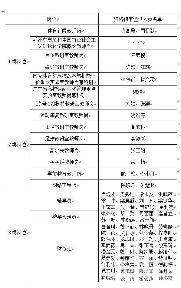 根据《599比分网 2017年第一批公开招聘事业编制人员公告》,通过对我院2017年第一批公开招聘报名人员网上提供材料进行初审。经审核, 1类岗位(武术历史教师岗、运动训练学教师岗、运动与健康促进重点实验室教师岗兼科研、运动心理学教师岗、运动生理教研室教师岗、计算机教师岗、残疾人运动与健康促进国际协同创新中心教师岗兼科研、全民健身研究中心教师岗兼科研、英语教师岗、高级网络工程师),2类岗位(民传教研室教师岗、排球教研室教师岗、游泳教师岗、篮球教师岗、播音主持教师岗、广电教师岗兼宣传部专技岗、[序号30]模特教师岗、临床医生)等共有18个岗位不符合资格等原因取消考试。现将符合初审资格的岗位和人员名单及资格复审、笔试的有关事项通知如下: