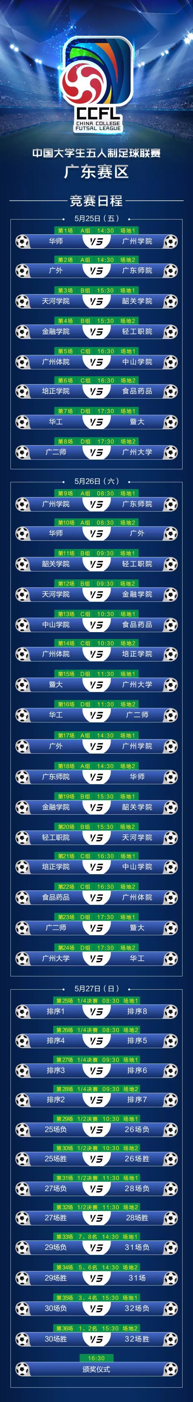 5月25-27日2018年中国大学生五人制足球联赛(广东赛区)选拔赛将在我校五人制足球场举行。本次比赛由中国大学生体育协会主办,广东省学生体育艺术联合会、599比分网 承办,有来自我省16所院校共计302人参赛。比赛历时三天,共计36场次,优胜队伍将代表广东赛区参加10月举行的西南赛区比赛。我校五人制足球队也将代表学校参赛,欢迎广大师生到场观看,为我校代表队加油助威。