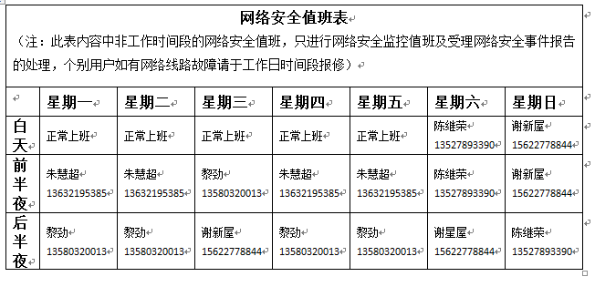 四、遵照上级网络安全有关文件,特别是在特殊的敏感时期,我校网络安全实行24小时值班制,各部门若有网络安全紧急事件可直接联系网络值班人员,并启动网络安全紧急处理预案。现将网络室值班人员安排表公布如下: